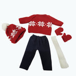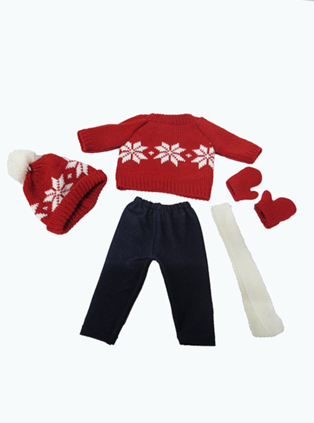 This adorable Red and White Sweater Set includes a sweater, scarf, leggings, mits, and beanie. Made to fit an 18″ Doll. Boots not included.