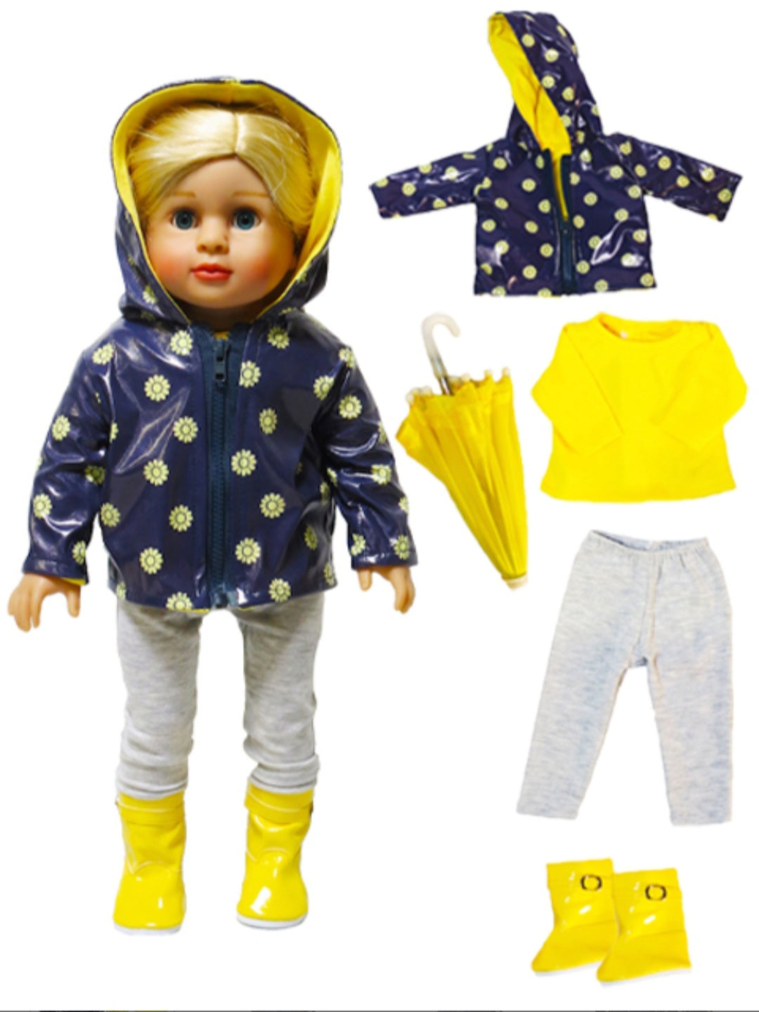 Includes navy raincoat with yellow daisy print, yellow long-sleeved undershirt, grey leggings, yellow rain boots, and yellow umbrella.