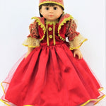 Transport your doll back to imperial Russia with this red and gold gown. This three piece outfit includes the red dress, red and gold headpiece, and matching jacket. The dress includes a velvet top with gold rose button details and a red tulle bottom with gold trim. The red crown includes a gold spiral pattern and a gold trim, with a ribbon tie in the back. The jacket is highly detailed with the same gold spiral pattern and gold sleeve details. Your doll will be dressed to impress any Russian Czar.