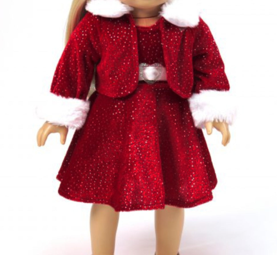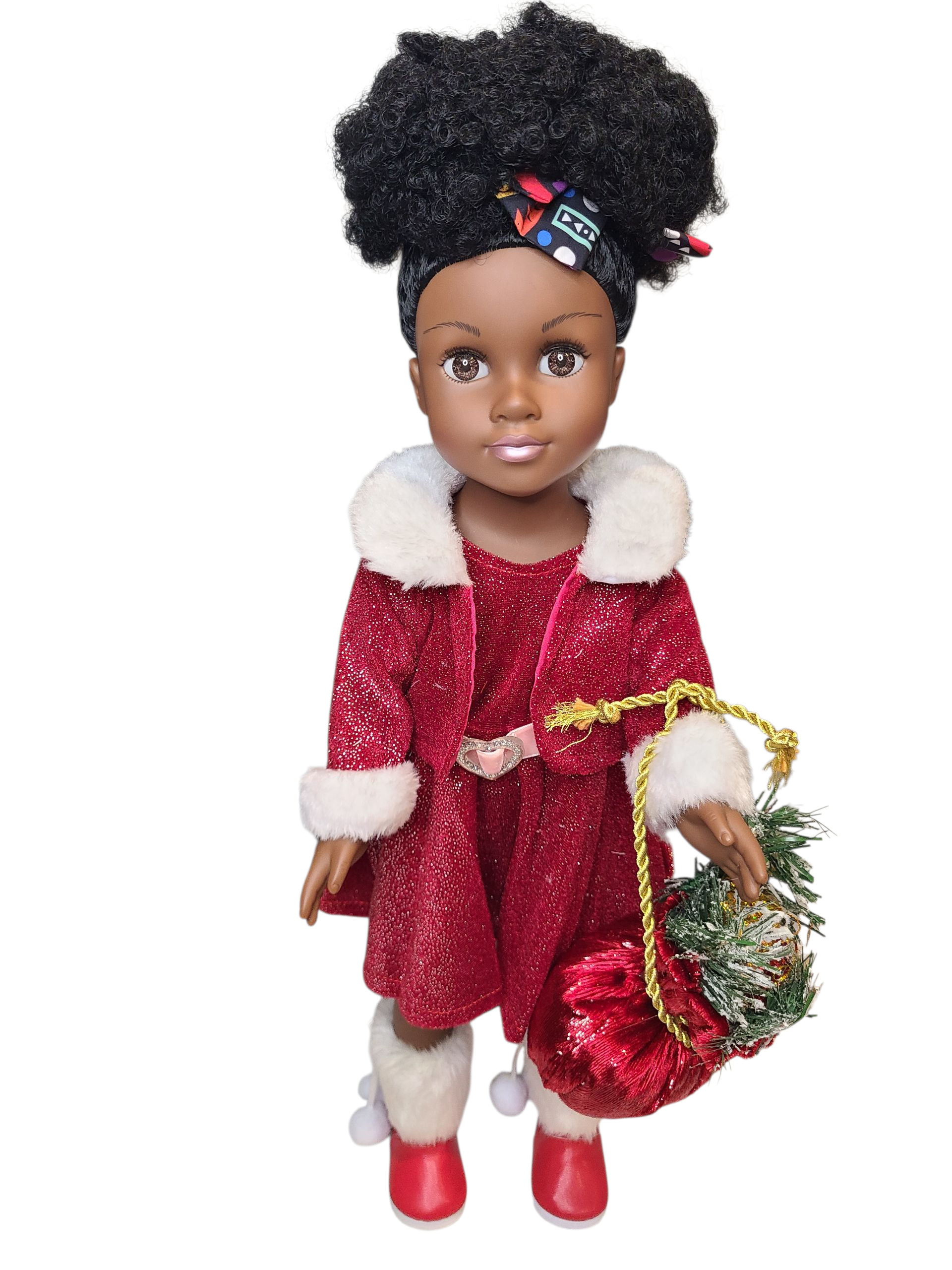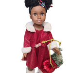 Christmas edition.  Beautifully 18" doll, dressed in Sparkly red dress with red coat. This doll is made of full body vinyl with dark brown skin, and curly hair. The doll comes with red boots, a santa bag and an additional original African print dress, headband and necklace.