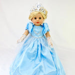 18" beautiful doll dressed blue princess dress, crown and gloves, paired with sparkling shoes. This doll has soft body and durable vinyl legs, arms and face. Doll has white skin and has long blonde hair. Eyes can blink. Bring the holiday cheers with this beautiful high quality doll.