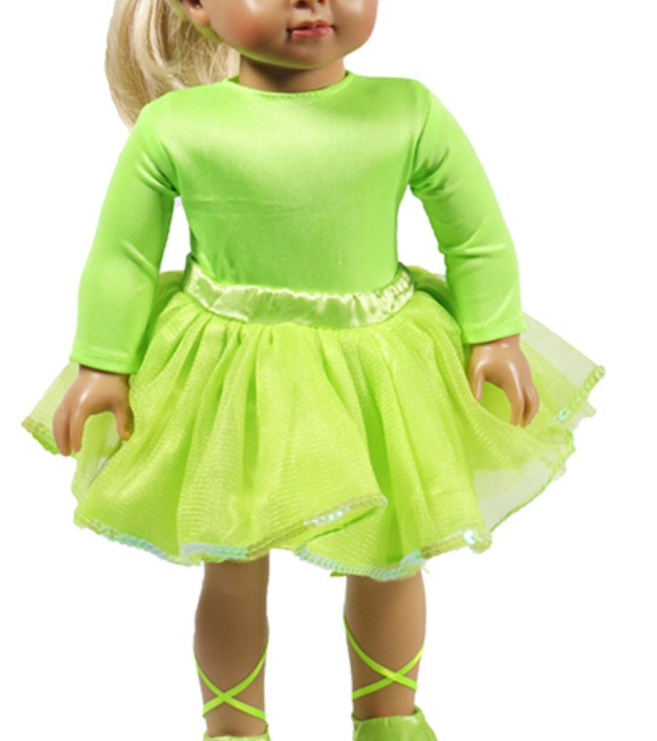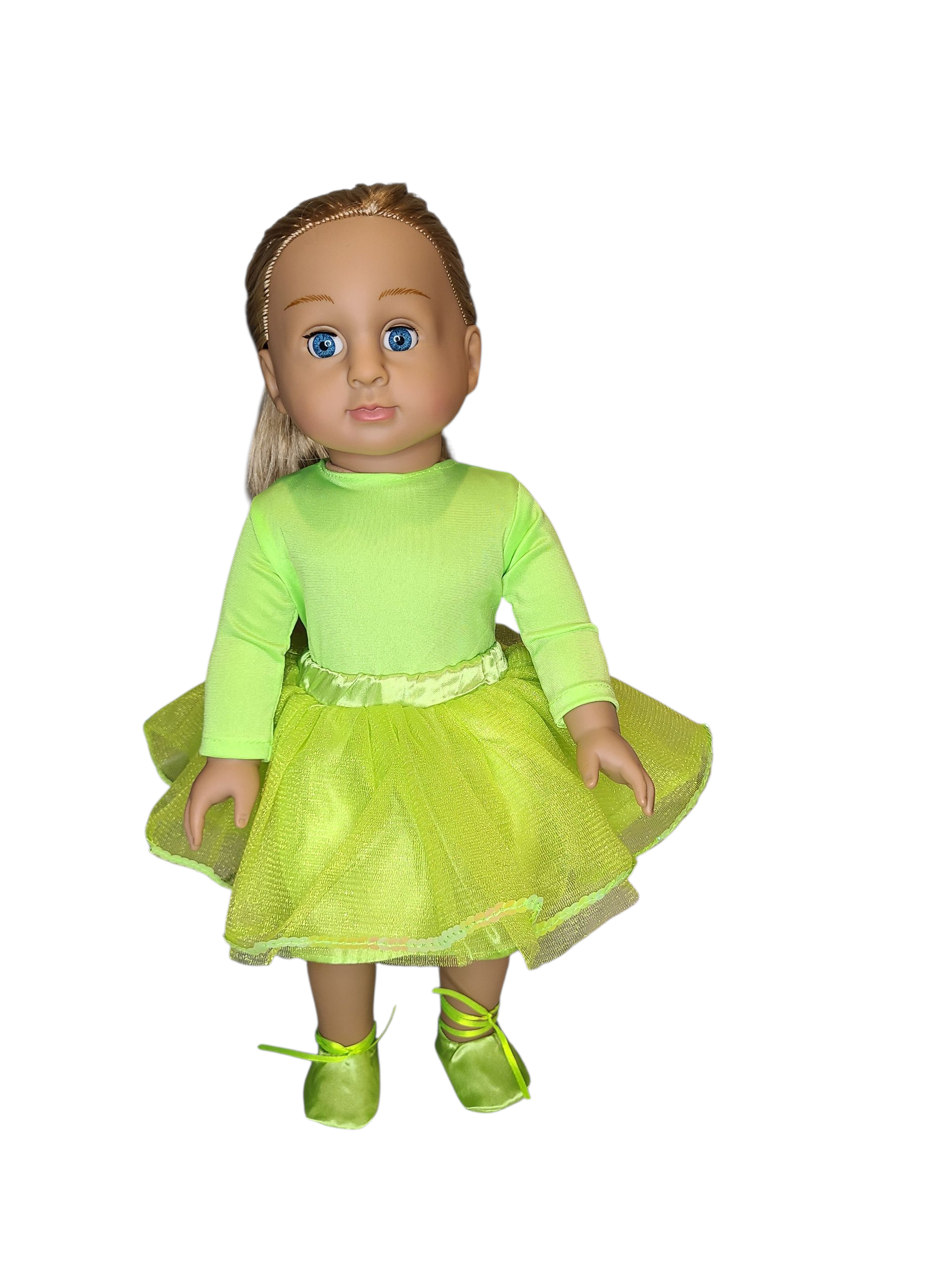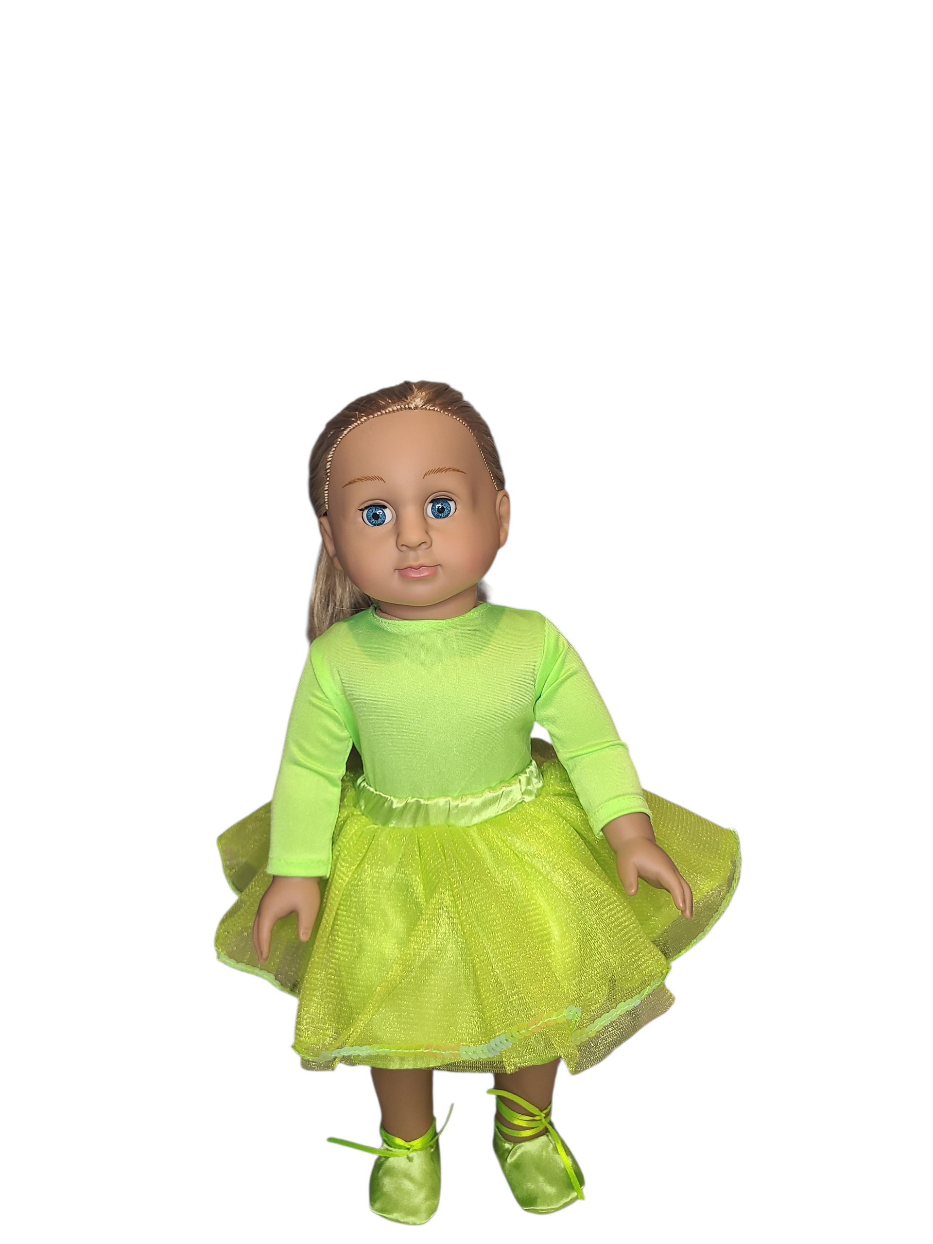 18 inch doll with blonde hair, blue eyes, made with vinyl and cotton filled soft body. Doll is wearing ballet inspired outfit: lime green Leotard, tutu skirt and ballet flats.
