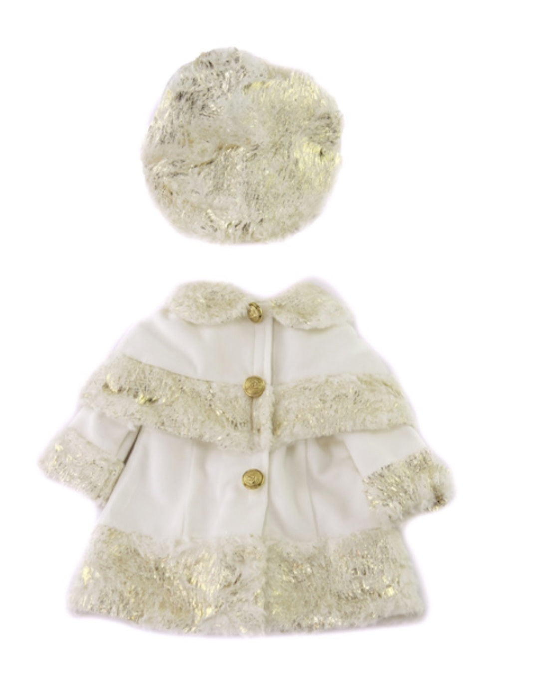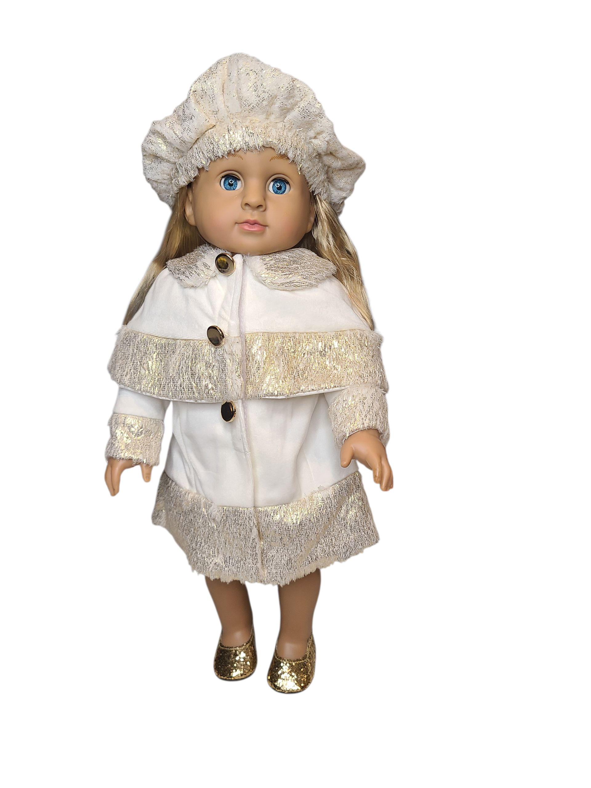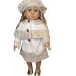 18" blonde doll with blue eyes. Vinyl and soft cotton filled body. Wearing this elegant white and gold coat outfit with matching hat and gold shoes.