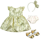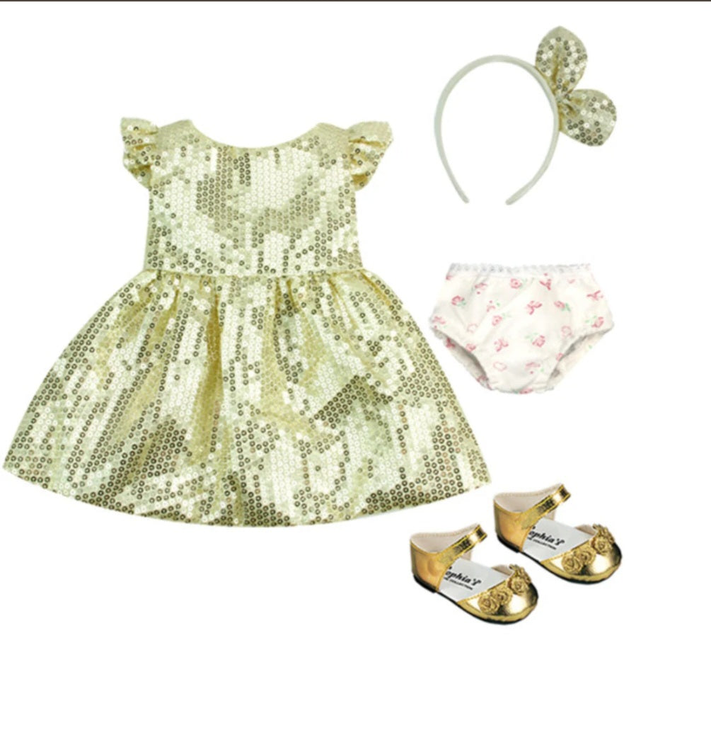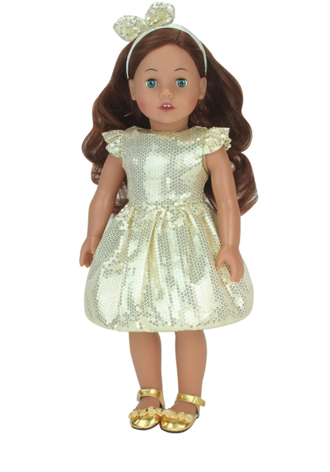- HIGH QUALITY: doll is dressed in an elegant gold sequin party dress with ruffled sleeve caps, a matching headband and gold dress shoes with rose bud embellishments. She is also wearing a pair of white, floral print underwear with lace trim.