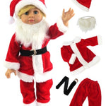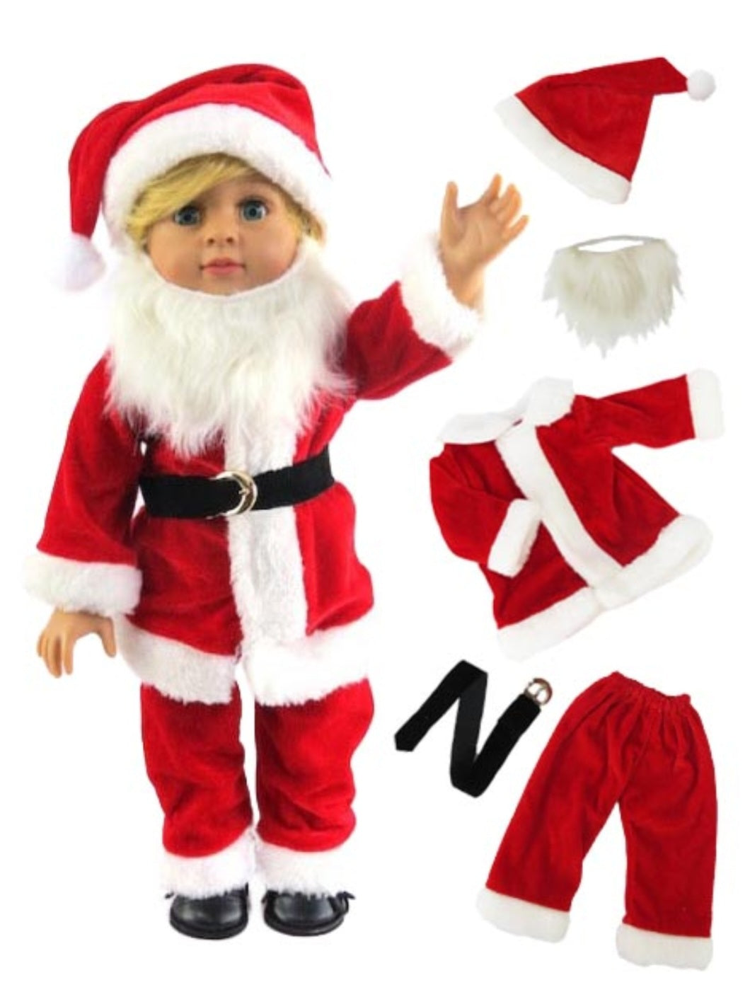 18 inch boy blonde doll wearing Santa outfit with shoes and Santa gift bag.