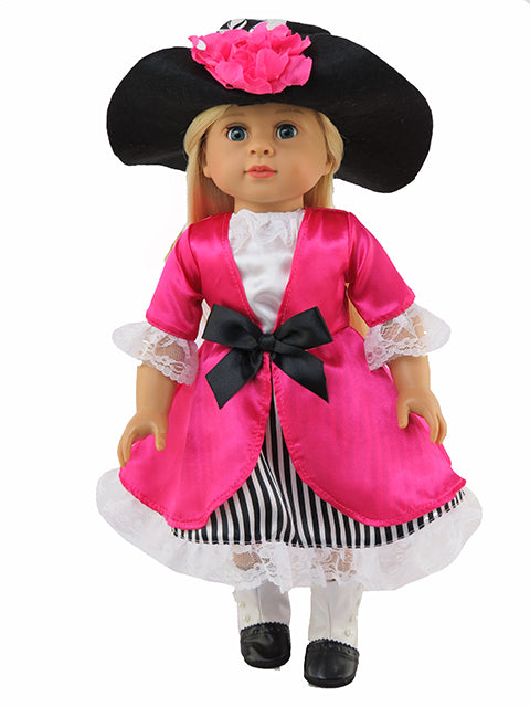Your favorite doll will be sailing the high seas in style with this pirate outfit. Includes black hat with pink rose and pink pirate dress with black bow.