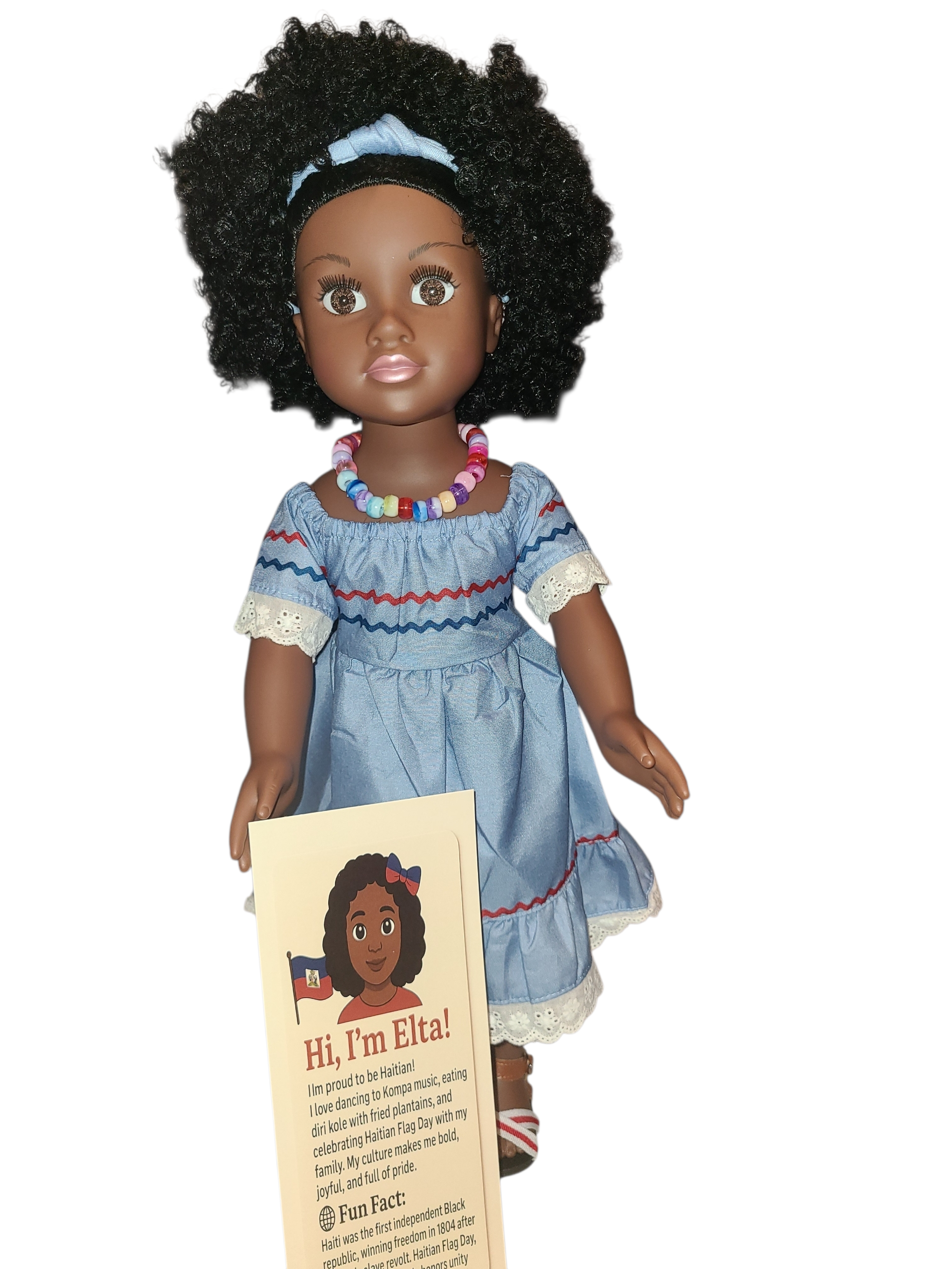 Elta celebrates the vibrant spirit of Haiti — a land rich in rhythm, resilience, and pride. With her warm brown skin and confident smile, she embodies the heart of Haitian culture, bringing joy and heritage to every playtime moment.